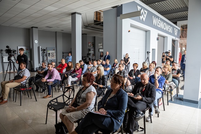 Termin Przemysłu 4.0 został zdefiniowany w 2011 roku. Moment ten nie był jednak początkiem czwartej rewolucji przemysłowej, bo ta zaczęła się znacznie wcześniej. WIŚNIOWSKI już w 2004 roku posiadał pierwszą maszynę, która wykorzystywała rozwiązania automatyzacji i robotyzacji produkcji. Przemysł 4.0 zapewnia tym procesom tzw. paliwo do działania – dane, generowane w sposób automatyczny już na etapie kontaktu z klientem, przesłane do maszyn poprzez systemy bazodanowe i szereg narzędzi IT. Po drugiej stronie mamy „silniki”, maszyny dedykowane do produkcji wyrobu, a między nimi stanowiska zrobotyzowane. Najczęściej wykonują prace precyzyjne, wymagające dużej powtarzalności, monotonne lub szkodliwe dla zdrowia człowieka – tłumaczył Tomasz Długopolski, Dyrektor Rozwoju Technologicznego w firmie WIŚNIOWSKI. Na zdjęciu poniżej, dziennikarze na konfrenecji podczas obchodów 30-lecia firmy