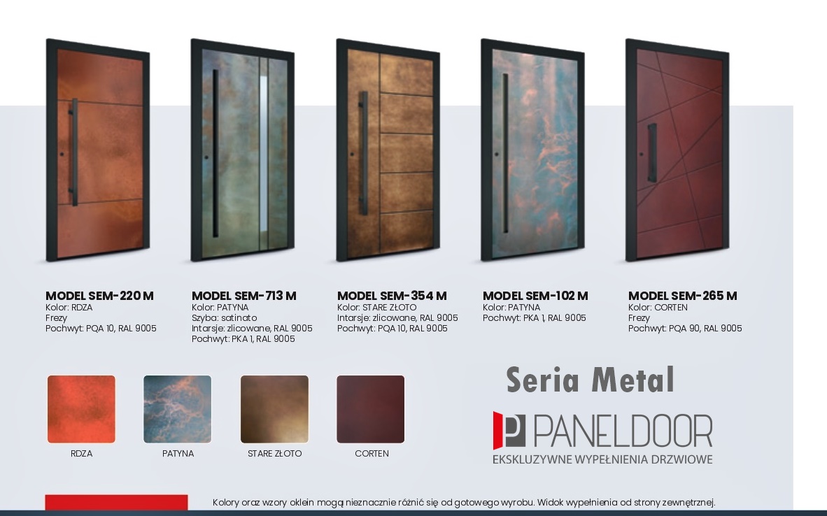 Firma Paneldoor, chcąc ułatwić to zadanie producentom drzwi zewnętrznych, wprowadziła do swojej oferty ekskluzywną serię wypełnień drzwiowych pod nazwą METAL. Nowa seria może być doskonałym uzupełnieniem oferty dla producentów drzwi poszukujących unikalnych rozwiązań dla swoich klientów. Trwałość i elegancja to cechy, które charakteryzują najnowszą kolekcję wypełnień drzwiowych Paneldoor – seria METAL. Modele tej serii są dostępne w kolorach: Patyna, Rdza, Corten oraz Stare Złoto. Każdy egzemplarz jest unikatowy dzięki naturalnemu surowcowi i wysokiej jakości lakierowi.