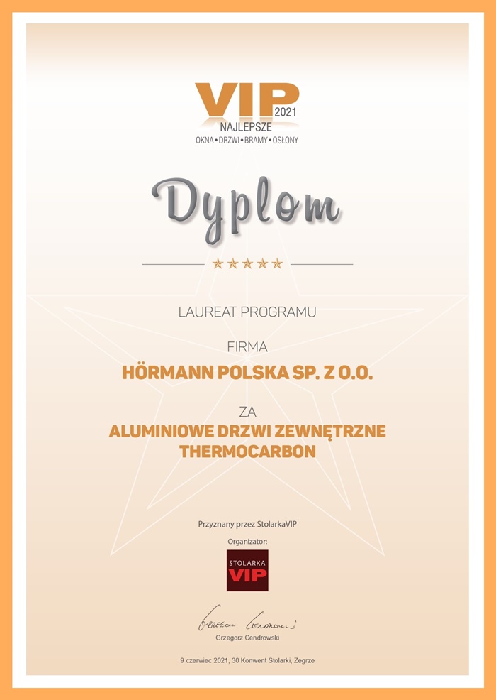 Drzwi zewnętrzne ThermoCarbon firmy Hörmann nagrodzone zostały w programie VIP Najlepsze Okna Drzwi Bramy Osłony 2021. Przyznane przez kapitułę programu nagrody wręczono podczas jubileuszowego 30. Konwentu Stolarki Polskiej, który w czerwcu odbył się w Zegrzu w Hotelu 500.