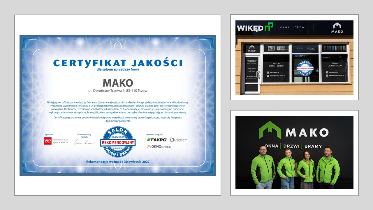 Salon Mako, ul. Obrońców Tczewa 6, Tczew – Salon, który z pasją i zaangażowaniem wprowadza nowoczesne podejście do sprzedaży okien i drzwi, oferując indywidualne doradztwo oraz fachowy montaż. Mako to przykład firmy, która buduje zaufanie oparte na doskonałości.