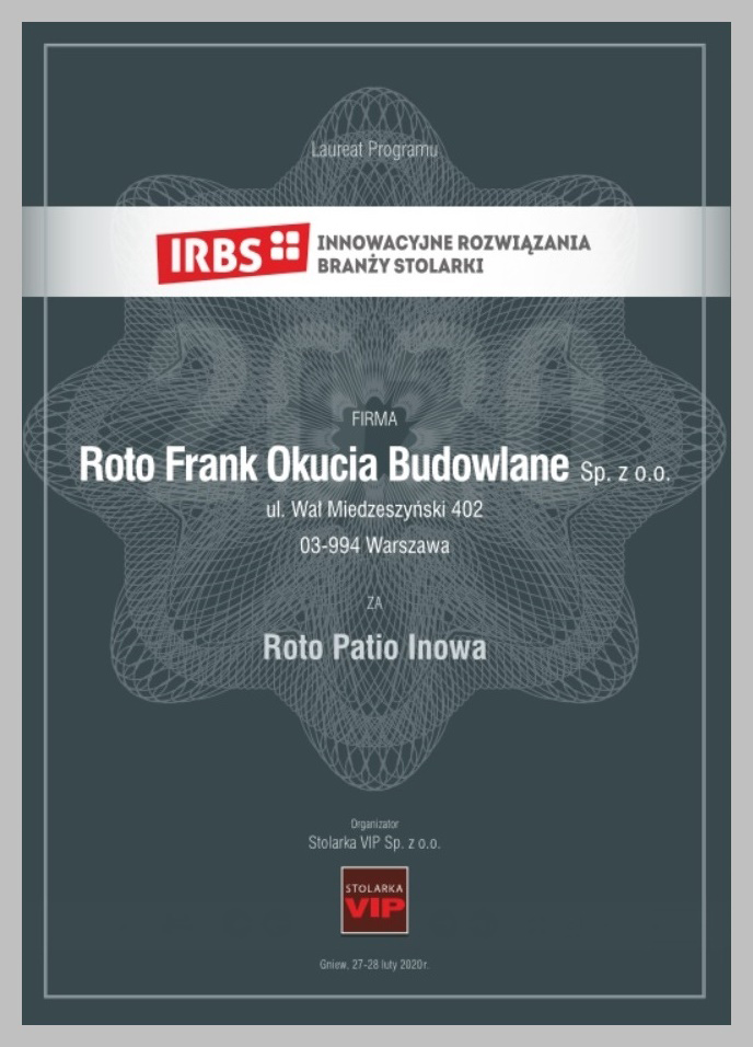 System okuć przesuwnych Roto Patio Inowa do bardzo szczelnych drzwi tarasowych został laureatem V edycji programu IRBS 2020. Kapituła wyróżniła połączenie intuicyjnej obsługi drzwi z wysoką izolacyjnością termiczną i akustyczną oraz ochroną antywyważeniową.