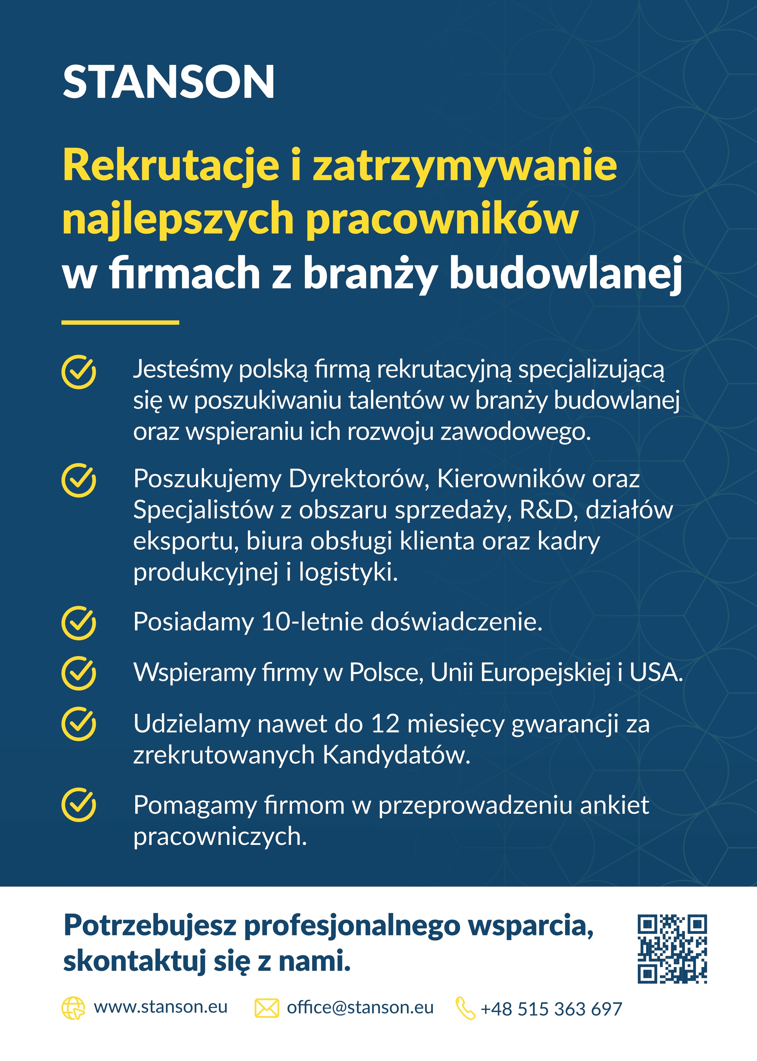 Stanson to wyspecjalizowana w branży budowlanej firma rekrutacyjna i doradztwa personalnego. Działa od ponad 10 lat i zajmuje się poszukiwaniem managerów najwyższego oraz średniego szczebla, a także wspieraniem ich rozwoju zawodowego. Swoim zasięgiem obejmuje Polskę, Unię Europejską oraz USA.