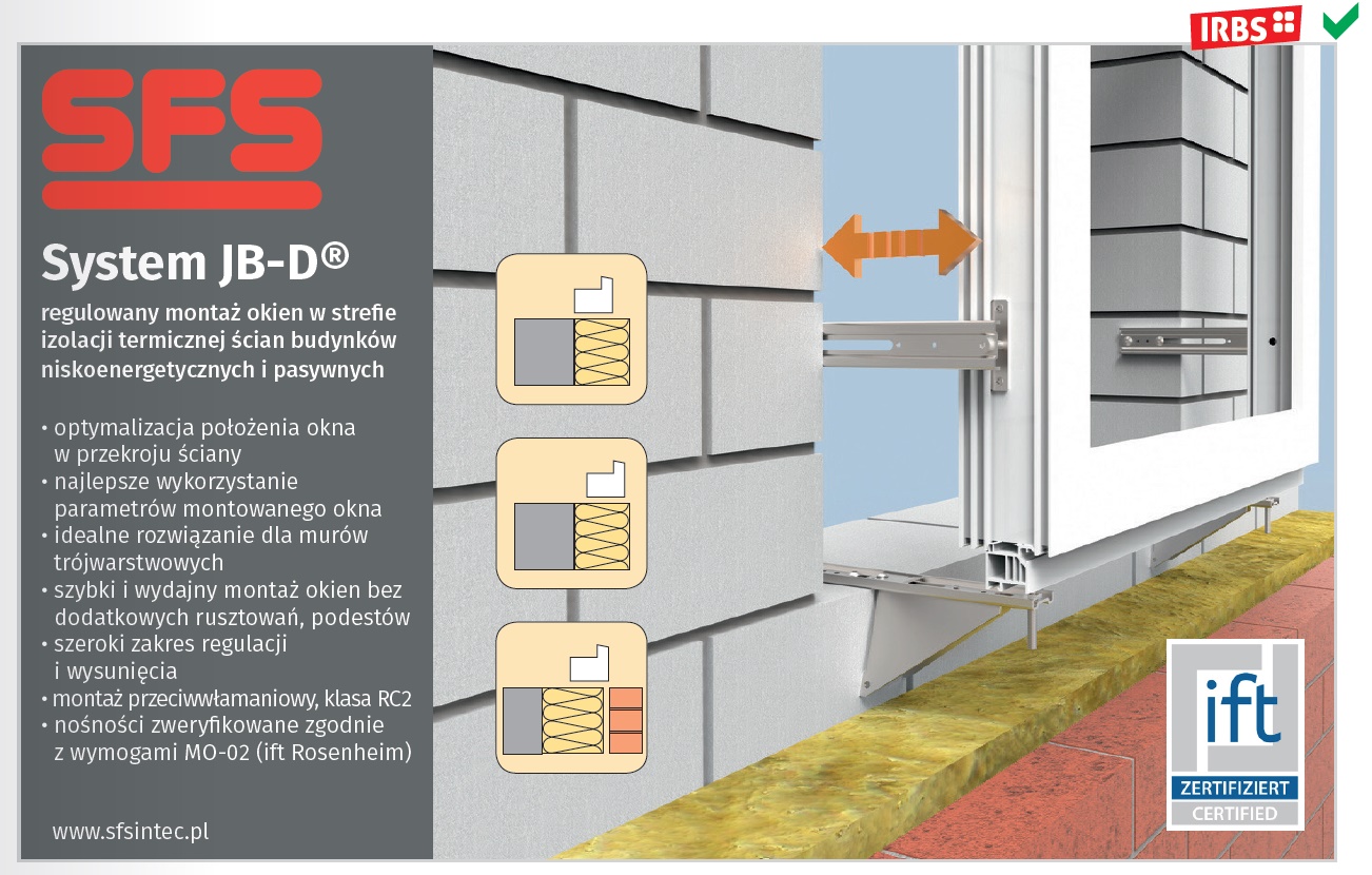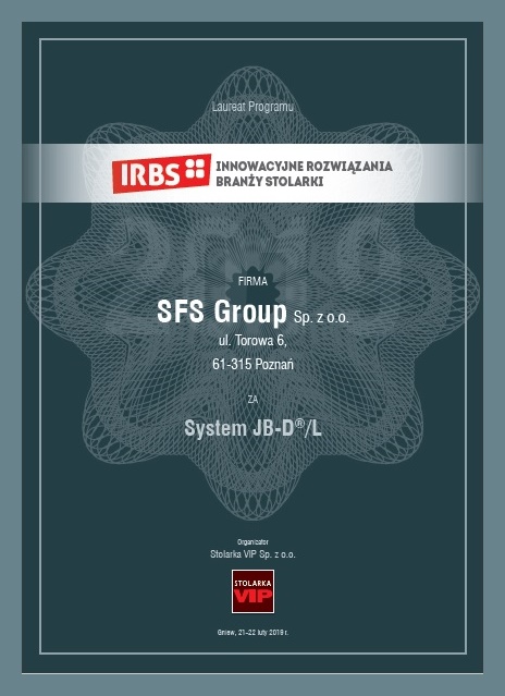 Firma SFS Group została wyróżniona w Programie IRBS – Innowacyjne Rozwiązania Branży Stolarki za kompleksowe rozwiązania elementów do mechanicznego montażu okien w strefie izolacji termicznej ścian warstwowych budynków energooszczędnych i pasywnych, czyli System JB-D.