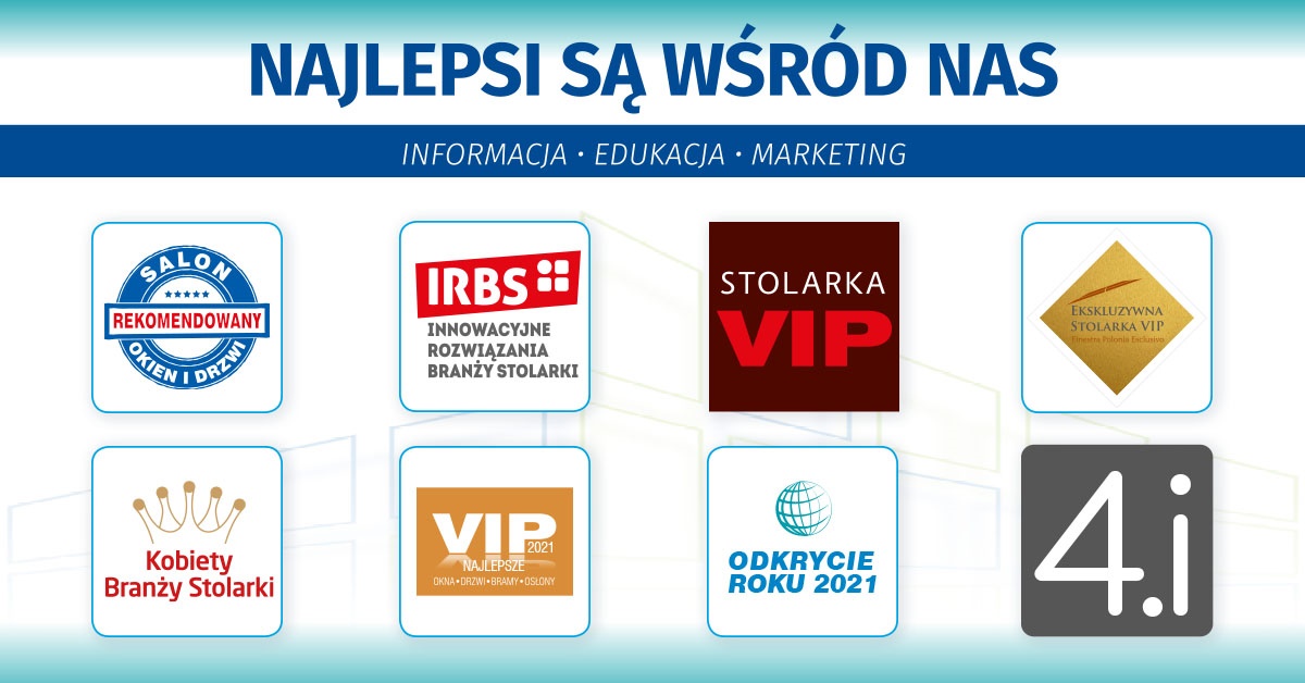 Jesteśmy twórcami cenionych inicjatyw branżowych, takich jak: Rekomendowane Salony Stolarki, Innowacyjne Rozwiązania Branży Stolarki, Kobiety Branży Stolarki,Innowator Branży, EkoProdukt, VIP Najlepsze Okna i Drzwi, Salon Roku, Projekt Roku, Quality&Design, czy CSR-Najlepsze projekty prospołeczne.